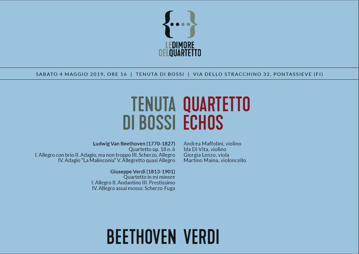 Sabato 4 maggio alle 16 un nuovo concerto organizzato da Le Dimore del Quartetto. Questa volta sarà la Tenuta di Bossi ad ospitare il Quartetto Echos che suonerà musiche di Ludwig Van Beethoven e Giuseppe Verdi.