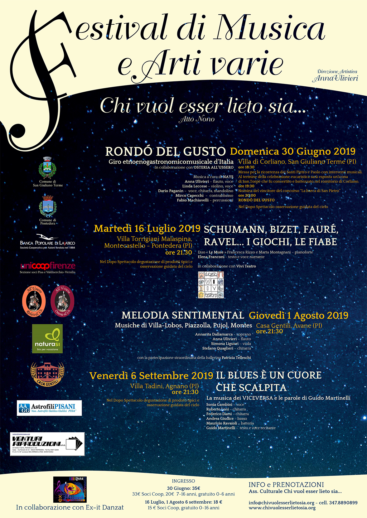 Il Festival di Musica e Arti Varie “Chi vuol esser lieto sia…”, con la direzione artistica di Anna Ulivieri, è giunto alla sua IX edizione. Anche quest’anno saranno le dimore storiche pisane ad ospitare i 4 appuntamenti.