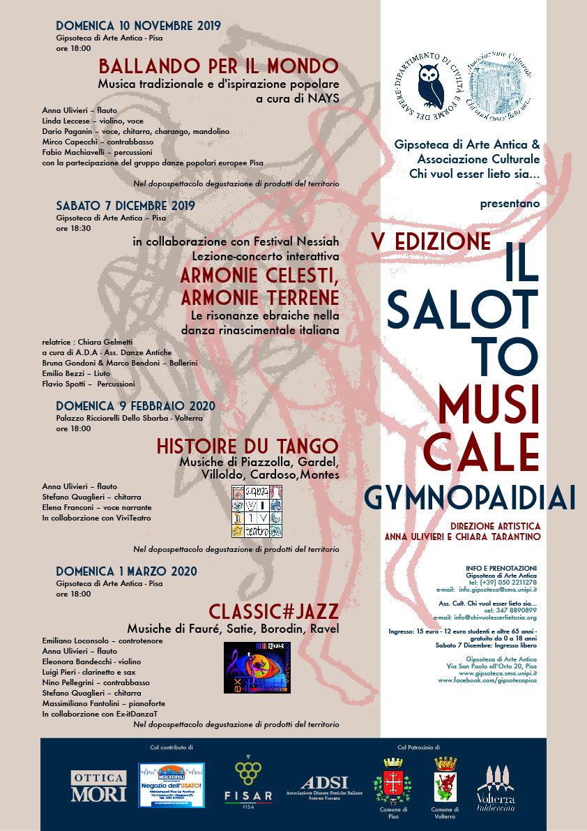 Quest’anno viene celebrato il connubio tra musica e danza in mezzo alle divinità greche della Gipsoteca di Arte Antica dell’Università di Pisa e anche tra le antiche mura di Palazzo Ricciarelli Dello Sbarba di Volterra portandovi tango, danza rinascimentale ebraica, balli tradizionali e d’ispirazione popolare, ma anche pavane, bourrèe, sicilienne che incontrano il jazz.