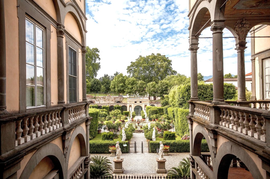 Lucca. Via degli Asili. Un breve e angusto tratto nel cuore del centro storico. Qui, al civico 33 un grande portone si apre su uno fra i più sfarzosi edifici lucchesi, Palazzo Pfanner. Un unicum in città. Tuttavia, la pur imponente facciata, un po’ soffocata dall’ubicazione, non può dare l’esatta dimensione del corpo di fabbrica e neppure riesce a far percepire la bellezza degli ambienti e dello spettacolare giardino. Insomma per ammirare l’edificio in tutto il suo mosso e armonioso disegno ci si deve recare sulle mura, dove ci si aprirà uno spettacolo inaspettato. Il più bel giardino del centro storico lucchese diventa il lussuoso prologo della facciata posteriore del palazzo, composta da due simmetrici corpi di fabbrica aggettanti sullo spazio verde.