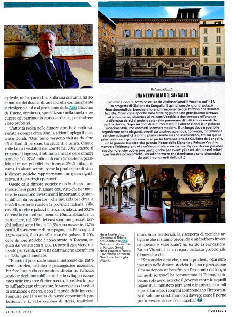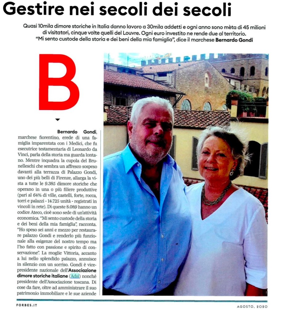 Quasi 10mila dimore storiche in Italia danno lavoro a 30mila addetti e ogni anno sono mèta di 45 milioni di visitatori, cinque volte quelli del Louvre. Ogni euro investito ne rende due al territorio. “Mi sento custode della storia e dei beni della mia famiglia” dice il marchese Bernardo Gondi