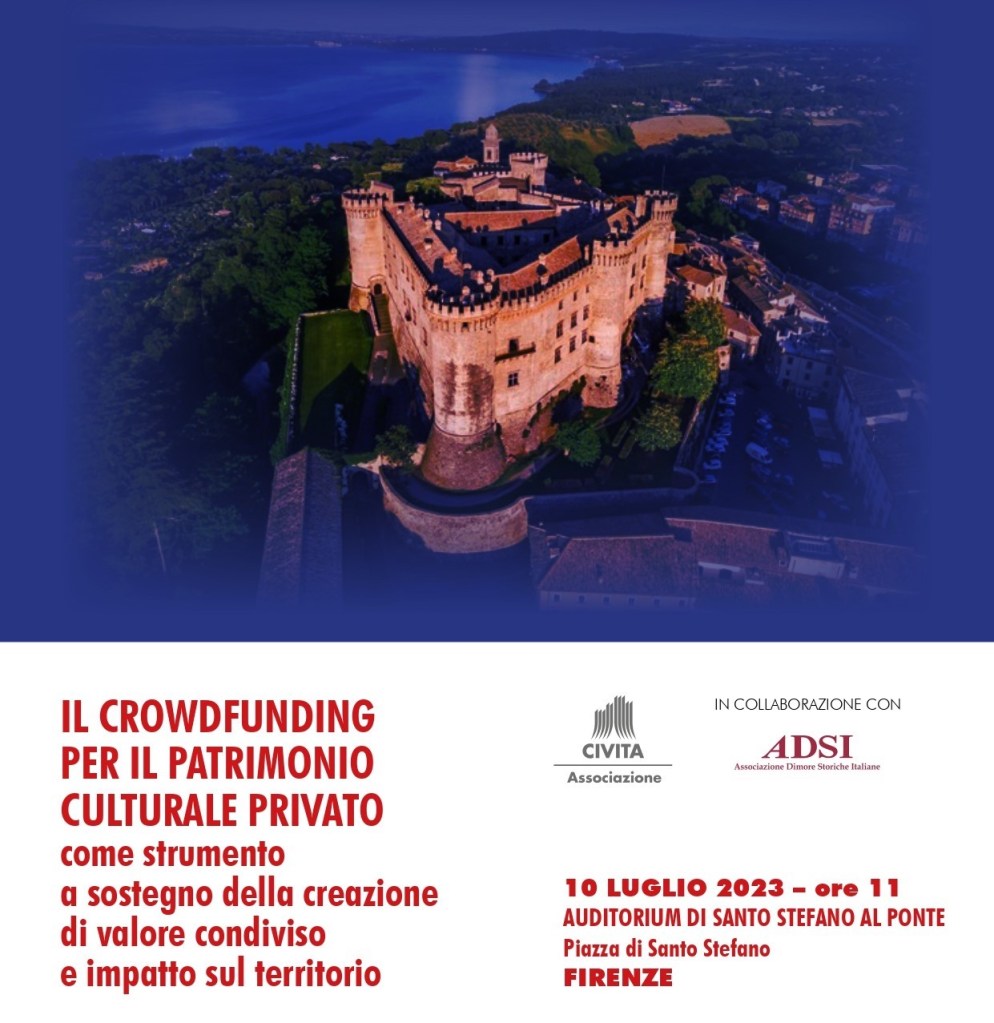 L’Associazione Civita, in partnership con Associazione Dimore Storiche Italiane (ADSI), è lieta di invitarla a Firenze, il prossimo 10 luglio, all’incontro IL CROWDFUNDING PER IL PATRIMONIO CULTURALE PRIVATO come strumento a sostegno della creazione di valore condiviso e impatto sul territorio.