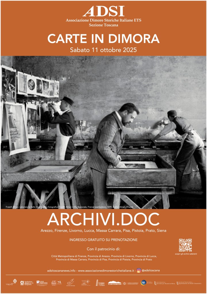 Sabato 11 ottobre torna per il quinto anno consecutivo Archivi.doc, l’iniziativa toscana che si svolge all’interno dell’evento nazionale “Carte in dimora”. Archivi e Biblioteche: storia tra passato e futuro” l’iniziativa promossa dall’Associazione Dimore Storiche Italiane (ADSI) che apre gratuitamente al pubblico oltre 40 archivi privati delle grandi famiglie italiane e di istituzioni museali, religiose e laiche: un vasto patrimonio di documenti, mappe, pergamene, foto, disegni d’artista, progetti, libri contabili di aziende agricole, eccezionali raccolte librarie. Un patrimonio immenso che grazie al lavoro di archivisti e storici, tramanda le preziose tracce del nostro passato e sono linfa vitale per il nostro futuro.
