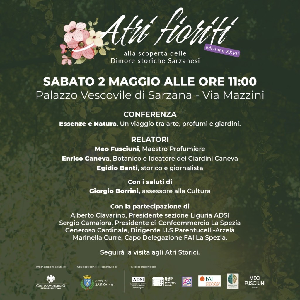 La XXVII edizione di “Altri fioriti alla scoperta delle Dimore Storiche Sarzanesi” prevede sabato 2 maggio alle 11 nel Palazzo Vescovile di Sarzana (via Mazzini) la conferenza dal titolo “Essenze e natura. Un viaggio tra arte, profumi e giardini”.